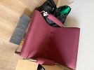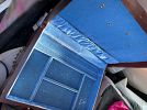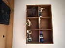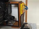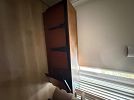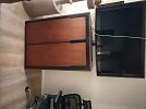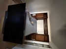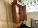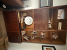 Apartment D. Beige leather loveseat recliner, walnut 42” wide wall unit, wall unit, rolltop desk, walnut bookshelves, walnut/black bedroom set with light bridge, books and miscellaneous