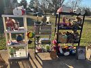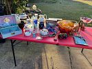 Antiques & Collectables. Milk glass, quilts/blankets, upcycled flannels, pottery, christmas, wicker mannequin, pictures, old signs, old cooler, vtg suitcases, vtg carnival glass punchbowl w/ glasses, some small furniture, old high chair, childrens books, old pool balls, lamps, side mirrors for old vehicle, corningware dishes, thermoses, and lots more not listed!!