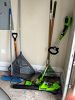 Garden tools like mower (gas), blower (gas and battery), trimmer (battery, spate, rakes...