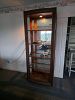 Tall wood shelving with glass shelves and mirrored back