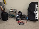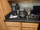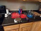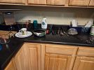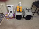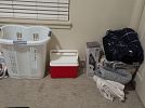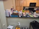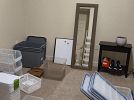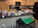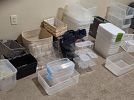 Variety of household furniture, bookshelves, crafting and scrapbooking supplies, kitchen items including a new juicer many, many organizational bins, womens clothing (sizes small and medium), tennis rackets, pet supplies, miscellaneous items.