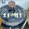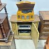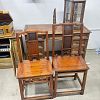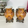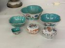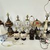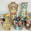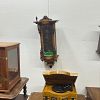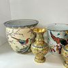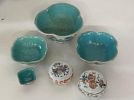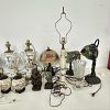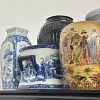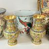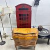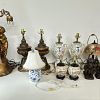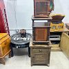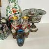 Garage sale featuring a variety of vintage and antique household items, as shown in the photos. The sale includes floor and table lamps, Asian porcelain and ceramic bowls, vases, and covered jars, decorative pottery, carved wooden chairs, cabinets, chests, side tables, clocks, record players, and other unique home décor pieces. A wide mix of styles and eras with many interesting and hard-to-find items.