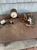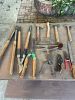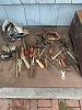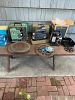 Garage full of tools, vintage camping equipment, table saw, various hardware, gas BBQ, old radios, old movie projector, vacuum cleaners, records, 2 bicycles, picnic table, folding chairs, vintage Avon, china cabinet, refrigerator, clothes dryer, stove, file cabinet, etc, etc.