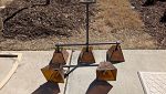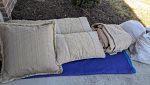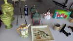 Large variety of items for sale - help us lighten the load in the moving truck! Yellow Storage cabinet with glass, holiday decor, custom beige queen bedding including pillow inserts (from Boyles), throw pillows, green/gold tablecloth for a 30-inch round glass table, 6-ft Christmas tree, outdoor dining table, Pottery Barn mica chandelier and matching scones, Metal pretzel container, gray and white diamond pattern rug, rooster hook, chrome towel rings, Chinese figure cookie jar, gumball machine, Women's shoes (7.5), show tray, clothes, mirror, sound machine, alarm clock, damn it doll, door stop, massager, lightbulbs, propane tanks, grill, toolbelt, William Sonoma napkins, artwork, wall stencils and 6-cube storage (Threshold).