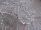 Glassware: 4 section condiment dish, 2 - rimmed large glass bowls, cream and sugar set, Near Cut 6" glass bowl, large silver-rimmed salad bowl with silver server, 8" square scalloped bowl