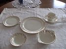 Taylor, Smith & Taylor - Pattern TST965 (circa 1948) 4 footed cups, 8 saucers, 8-10" plates, 8- 7 1/4" plates, 8- sauce bowls, 8- cereal bowls, 1- sugar bowl (no lid), 1- 8" round vegetable bowl, 1- 10" oval bowl, 1- 13" oval platter.