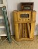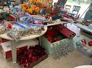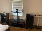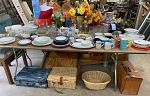 small flat screen TVs, China cabinet, dining table w/4 chairs, buffet, bar stools, several end tables/lamp tables, LAMPS, fans, clocks, Kimball console acoustic piano, queen bed, full bed, LOTS of bed linens, curtains, shower curtains, LOTS of dishware/glassware (some vintage), fall/Christmas decorations, Christmas trees, framed artwork, Lionel train set, walker, crutches, pet carriers and MORE!