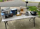 Hammocks (1) with stand & (1) cotton multi color, Bicycles (2) hard-tail mountain (1) city cruiser, Toys (dinosaurs, video game characters, Gundam and die-cast military vehicles, tanks & airplanes), Books, computer monitor (Acer LED 23") like new, 26" Vizio TV (flat screen), military uniforms, luggage, garment bags, soft brief cases, golf bag, golf clubs, golf balls, ski bag (like new), sporting and camping equipment, Yamaha Guitar (like new), bongos (like new), Household goods, small appliances, linens/decor, women's small/petite dresses, books, CD's, DVD's, twin air mattresses, wax machine (hand or foot), soft roof carrier, 50 watt suitcase solar panel, elect. knife sharpener, Snow babies (Christmas item), men's jungle boots 11.5, men's black combat boot 11, Hillary tent, Coleman battery lantern, Coleman single burner (1lb canister set up), Z-lite Sol backpacking folding sleeping pad and lot's more.