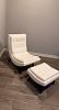 Furniture: Tustin Chair and Ottoman Set(White Leather). Dark Blue Tufted Platform Bed, Mattress & Bunkie Board,
