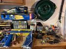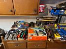 TOOLS:20 FT. ALUM. EXT. LADDER, HAND TOOLS, HARDWARE, CAR CARE PRODUCTS, CHILTON CAR MANUELS, CARPENTER TOOLS, PARKER BENCH VISE, BLU-MOL HOLE SAW SET, B&D BLOWER, BENCH GRINDER, 2 TON CABLE WENCH, SM. ELEC. HAND TOOLS, ELEC. DEWALT JIGSAW, SPRAY PAINT, ELEC, PRUNERS/TRIMMERS, 6 FT WOODEN STEP LADDER, TORO ELEC. LEAF BLOWER, GAS CAN, SM. SHOP VAC., SNOW SHOVELS, NEWER PITCH FORK, SHELVING UNITS, & MORE!