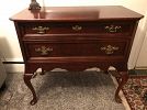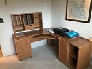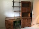 FURNITURE: NICE MODERN NEWER LIVING ROOM COUCH W/ ACCENT PILLOWS – COORDINATING CHAIR, ACCENT CHAIR, BASSETT QUEEN ANNE STYLE 2 DRAWER ENTRANCE STAND, “KATHY IRELAND” DINING SET THAT INCLUDES TABLE & 6 CHAIRS, MATCHING “KATHY IRELAND” BEAUTIFUL DISPLAY CHINA CLOSET, NICE ETCHED WALL MIRROR, ROUND ORNATE GLASS TOP COFFEE TABLE, 3 PC. WALL UNIT CONSISTING OF CENTER COMPUTER AREA W/ 2 BOOKCASES ON EACH END, PAIR OF GLASS TOP MODERN END TABLES, BEDROOM DRESSERS & CHEST OF DRAWERS, NICE 4 POSTER QUEEN SIZE BED, SINGLE BED, MODERN CORNER COMPUTER OFFICE DESK, KITCHEN TABLE & 2 CHAIRS, MATCHING KITCHEN BAR STOOL, CHILD`S ROCKER, NICE 1 DRAWER/2 DOOR STAND, VINTAGE MID CENTURY STYLE “LANE” CEDAR CHEST, NICE MODERN WHITE STORAGE CABINETS, & MORE!