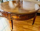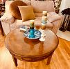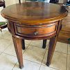 Large round wood coffee table and End table with drawers and detailed design.