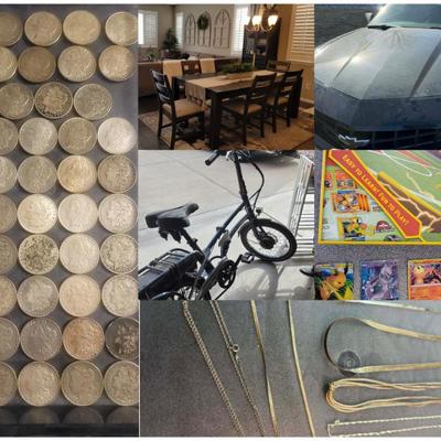 Stay tuned for description Client is staying at Home Every Night Please Respect her Space we are Armed please don’t try anything Items in home are: 2013 Chevrolet Camaro 2LS 3.6L LFX 103116 miles absolutely stunning vehicle Lots of silver stunning Morgan dollar coins fantastic years quality and color toned coins these coins are removed from property. Also our other client for the vehicle will be dropping the car off to us the day of the estate sale. Client is staying in home every night please don’t bug her thank you. All high-end items and Coins are removed from the House Shabby chic furniture Dressers Sideboard Metal cabinet Metal organizers cabinets Beds Amazing clothing Patio table and chairs Flower pots Halloween items TVs Gorgeous sectional sofa Coffee tables End tables Lamps Rugs Kitchen items Espresso machine Artwork Arts and crafts Decorative items Desk Levi jeans Other blue jeans Fake decorative plants Lots of costume jewelry Sterling Jewelry Tools Collapsible electric bike Ladder Christmas Easter Bar chairs Gorgeous Dining Table Blankets Towel Chemicals Toiletries Glassware Dish ware Pots and pans Candles Filing cabinet And so much more cant list everything.