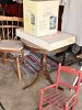 Furniture! Vintage claw foot coffee table, Drum table, nestle xxdisplay, plant stand, chairs etc. New in box bike.