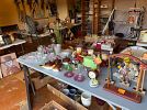 Vintage glass, Mexican art, Hummel figurines, designer decor, yard tools, children’s books, furniture, picture frames, prints, paintings, kitchen ware, wine glasses, steamer trunk, well curated items!!