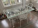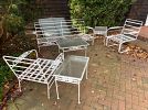 Outdoor furniture, teak lounge chairs, cast iron garden bench, garden statues. Groups of Mid Century Salterini and Woodard style metal furniture sets; dining table / chairs, benches, armchairs, end tables. Wicker sofa and armchairs. Decorative statues, pots, plant stands, etc. Collection of antique leaded glass transom windows