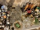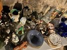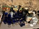 - Glassware and dishes, including cobalt blue stemware, serving pieces, vases, and decorative ceramics