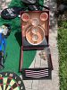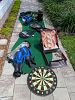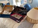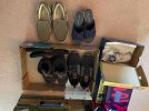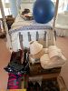 Men’s clothing, ladies, clothing, hats, shoes, curtains, kitchen stuff, glassware, exercise stuff, tennis rackets, swim fins, goggles, dartboard, ball toss game,