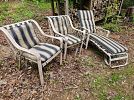 -3 pc Outdoor Furniture Set: 2 Chairs, 1 Chaise + Cushions - Very Sturdy, but old frames, nothing loose, heavy metal. Needs cleaning, and a couple of straps on chairs replaced. Cushions are newer. There is an extra Chaise cushion