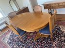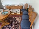 Dining room; Hand knotted oriental carpet, mid century French style dining table and chairs, mid century side board / buffet, china and crystal, royal doulton porcelain, figurines