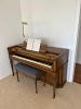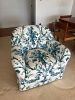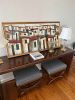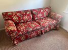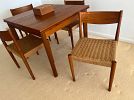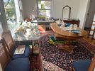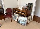 Living room; Mid century modern / Danish modern teak chairs and extension table, vintage piano, henredon chintz sectional sofa, French style furniture, original paintings, signed paintings and prints