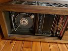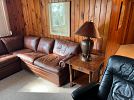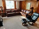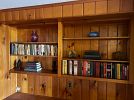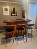 Basement; finished basement rooms with mid century modern desk, records and record player, leather sectional sofa, mission / craftsmen style end tables, copper lamps, bookcases, original artwork, mid century modern furniture, bar and bar stools