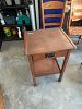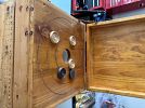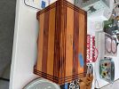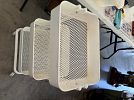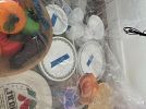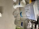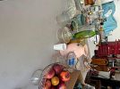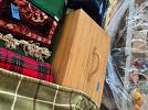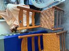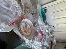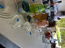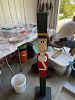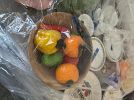 Bench, concrete planters, iron wood rack, rainbow vacuum, Barbie dolls, baskets