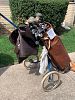 sports: bowlingball , old golf bag, cart and clubs, hand weights
