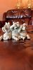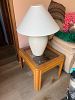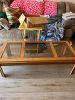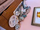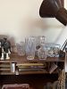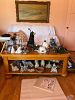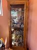 Mixed glasses, knickknacks, kitchen items, two coffee tables and end tables, BBQ tools, Christmas Sweatshirts, Quarry Critters, collectible bear figurines, black there tiered tv stand. King size bed from the 70s, Princess House casserole dish, two matching lamps.