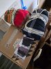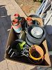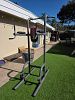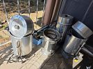 Misc: Backyard gas heater, outdoor exercise tower, yard chairs, cantilever umbrella, hammocks, coffee urns, dart board, gardening supplies, expandable travel work pack, candles, glass candle holders, and more.