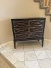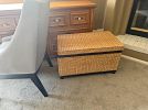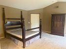 Furniture: Four-poster king bed frame, armoire, accent chairs, wood desk, dark console cabinet, storage ottomans, shelving units, white dresser/cabinet