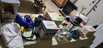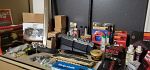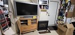 Household and craft items: 50" very decorative Sony Bravia TV (works great), electric fireplace,15 baskets (most from UK), boombox, dollhouse on wheels, misc kitchen & bathroom items, lots of yarn, plastic canvas sheets - large rectangle, circle, square and many more misc items.