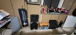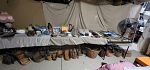 RV items: 50 amp 25 ft electric cable, fold-up ladder, RV Brake System, coil 25 ft water hose, sewer connectors and hoses, steel entry folding step, tray drawers for under table, and other misc RV items.