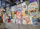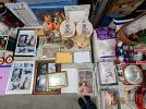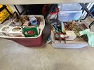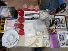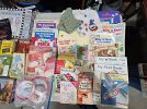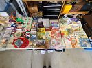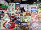Vintage items: costume jewelry, children’s books, rattle toys, board games, Tupperware, and counted cross stitch stitcheries.