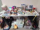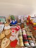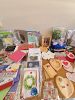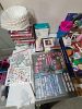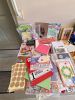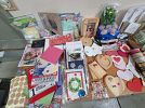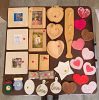 Craft supplies: unfinished wood items, spools of ribbon, fun foam, plastic hearts, beads, buttons, journals, card fronts, books, storage containers, and more.