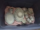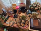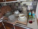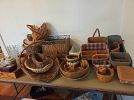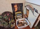 Lots of books, some vintage vinyl, Longaberger baskets, knick knacks, paddy whacks, Christmas decor, costume jewelry, dishes, crystal glasses, etc.
