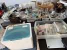 Lots of goodies!! Doggie items, like new Husqvarna sewing machine, dishes, yard fertilizer spreader, lots of jewelry, mostly Paparazzi (still in packaging, think Christmas presents!!) candlesticks, some collectibles such as West Highland terrier plates, Brown bag cookie cutters.