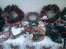 Decorative items, wreaths, candles.