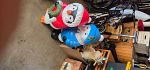 Variety of items including Christmas decorations, bicycles, toys, purses, books, clothes, shoes, chairs, tables, kitchen items.
