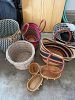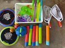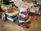 outdoor toys and skateboards, household items like plastic organizing bins, hangers and clothing racks, kitchen and dishes, kids books, novel books, cookbooks and vases.