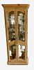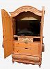 Beautiful vintage Pulaski Furniture solid pine wood hand-painted pink floral armoire. Solid wood. Hand-painted with a beautiful pink trim and floral design. Circa 1980s. Metal patinated bronze handles drawers with ornate design. Amoire dimensions are 80 inches tall at the highest point, 40 inches wide and 20 inches in depth. Curio Cabinet with Light and four Glass Shelves and Bottom Shelf. Dimensions 78” Tall, 27” wide, 13” in depth. Buy together or separately.