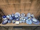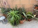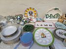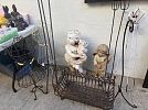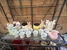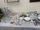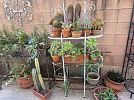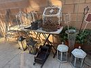 Spring sale featuring a glass top wrought iron square patio table; an assortment of plants, especially exotic cacti; Easter decor and linens, including items from Williams Sonoma; blue and white decorative accessories; and garden ware. Proceeds from this sale will be donated to the St. Vincent de Paul Society to help the poor in the neighborhood.
