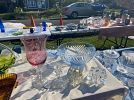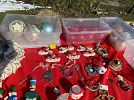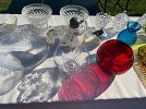 Vintage: Shiny Brite Xmas ornaments, lots of other ornaments, glassware… Wedgewood, Depression glass, colored glass, tea set, Atlantic ceramics, pressed glass, cut glass, toys, Erector set, etc.