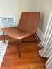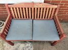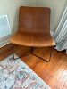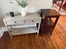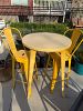 2 West Elm leather chairs ($100 each), yellow high top patio table ($30) Ikea weathered red bench ($40)