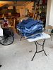 Kitchen items, Tables, chairs, various tools, dining room set, lamps, stationary bike, bicycle, kayak w/ paddle, life jackets, outdoor recliner, TONs men clothes size large & XL, TONs of women clothes size 12-16, vintage jeans, planters/pots, plants, paintings, frames, linens, dorm refrigerator, window ac, lawn mower, desks