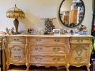 SALE INCLUDES : MID-CENTURY THOMASVILLE BEDROOM SCULPURAL ARCHES BED RM SET . KING SZ. BED RM. SET, KITCHEN CHAIRS , 3 COFFEE TABLES /SIDE TABLES, ANTIQUE 1930s LIVING RM. SET, ANTIQUE INLAYED CREDENZA, ANTIQUE HUTCH , 2 FRENCH TWIN BEDS, AND MUCH MORE