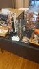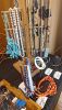 Chain saws, misc cords, cookware and more. Fryers, pots and pans, collectable dishes.