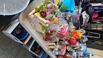 Many items from men's craftman tools ladies jewelry clothes purses birdhouses lily's of the valley and chocolate mint plants to kids clothes and toys and a motorcycle. Gardening items and books, craft items, antiques and vintage jewelry and other items Polaroid Camera, old Movie projector