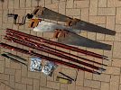 TOOLS: Numerous Old Saws, Auger Brace Hand Drill, Construction Level, Steel Files, Hanging Hooks, Kid’s Cane Fishing Poles, Train Conductor Lantern, Camping Lantern, Sure Seal Drip Torch