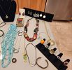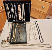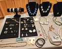 JEWELRY-Dozens of Gold and silver chains/bracelets/rings/unique vintage jewelry/hand beaded necklaces/earrings/sterling silver pendants&earrings/wooden&beaded jewelry/mini vintage sterling silver telephone/coffee pot/teapot pins/Necklaces from Finland&Ireland, Japanese prayer bracelet/vintage rhinestone/topaze blue glass bracelets/showy rhinestone brooch/vintage copper bracelet w/Celtic design/vintage clip on earrings/pins/brooches/rare mid century milk glass earrings/vintage mother of pearl brooch/sterling silver pendants, earrings